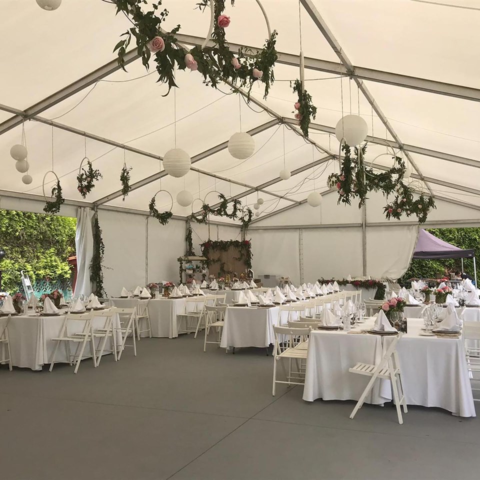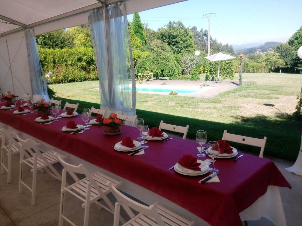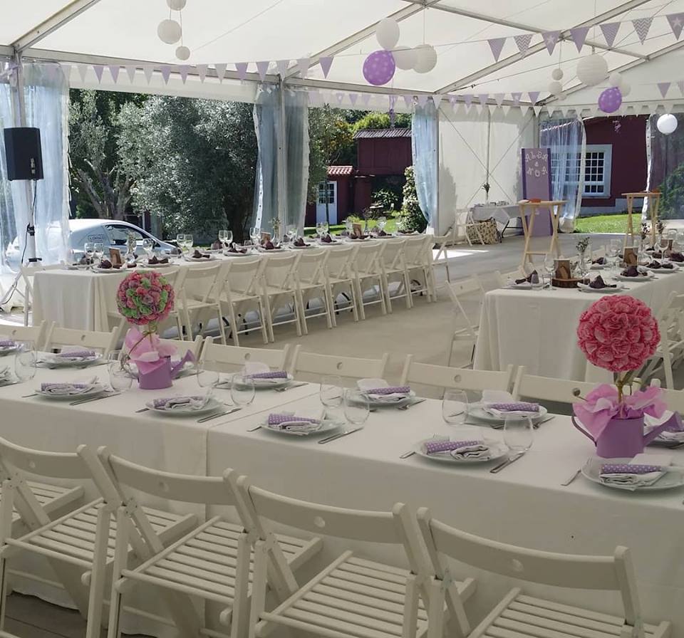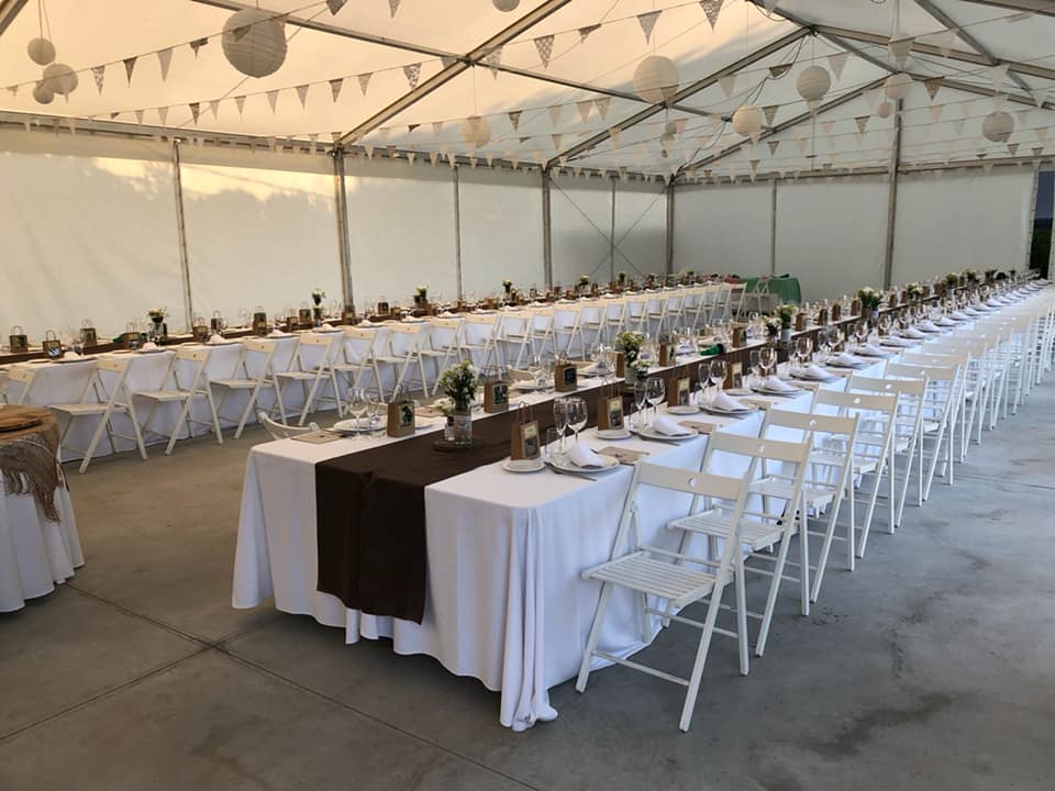 Dispones de mesas y sillas para distribuir cómodamente a tus comensales. Además, pensando siempre en la comodidad y en preservar la privacidad de la casa, se han instalado aseos de señoras y caballeros con acceso desde la carpa.