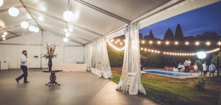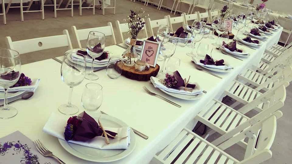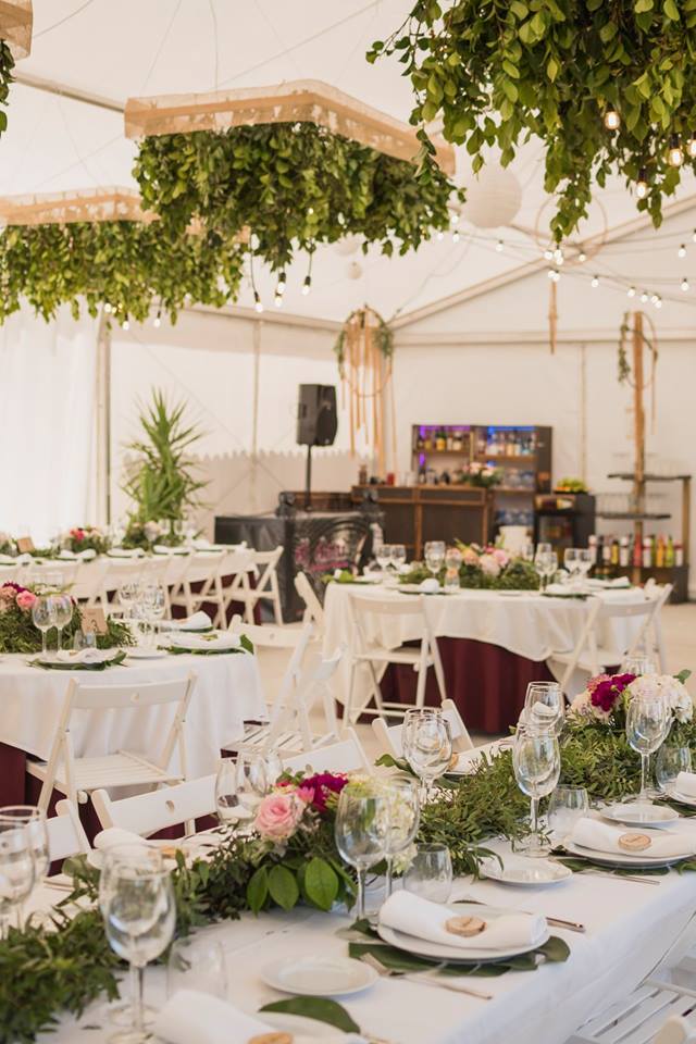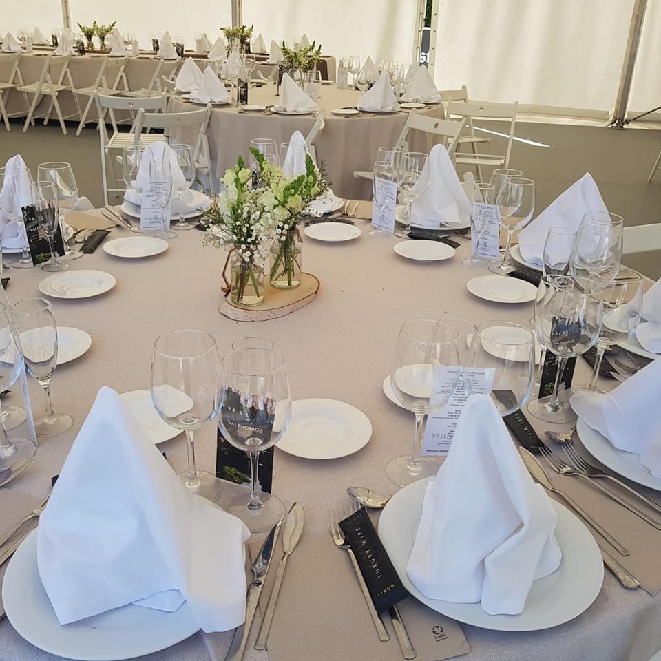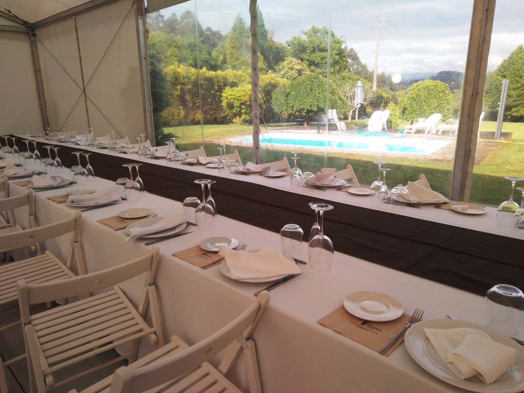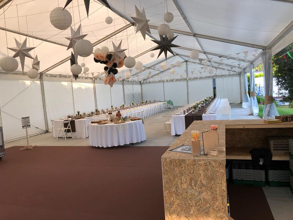 Dispones de mesas y sillas para distribuir cómodamente a tus comensales. Además, pensando siempre en la comodidad y en preservar la privacidad de la casa, se han instalado aseos de señoras y caballeros con acceso desde la carpa.