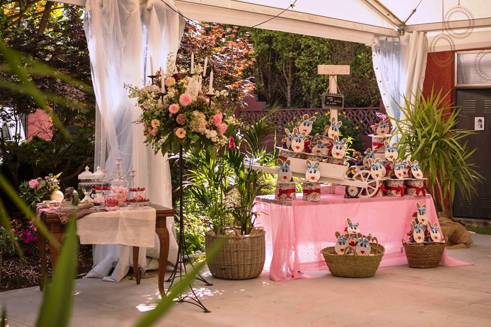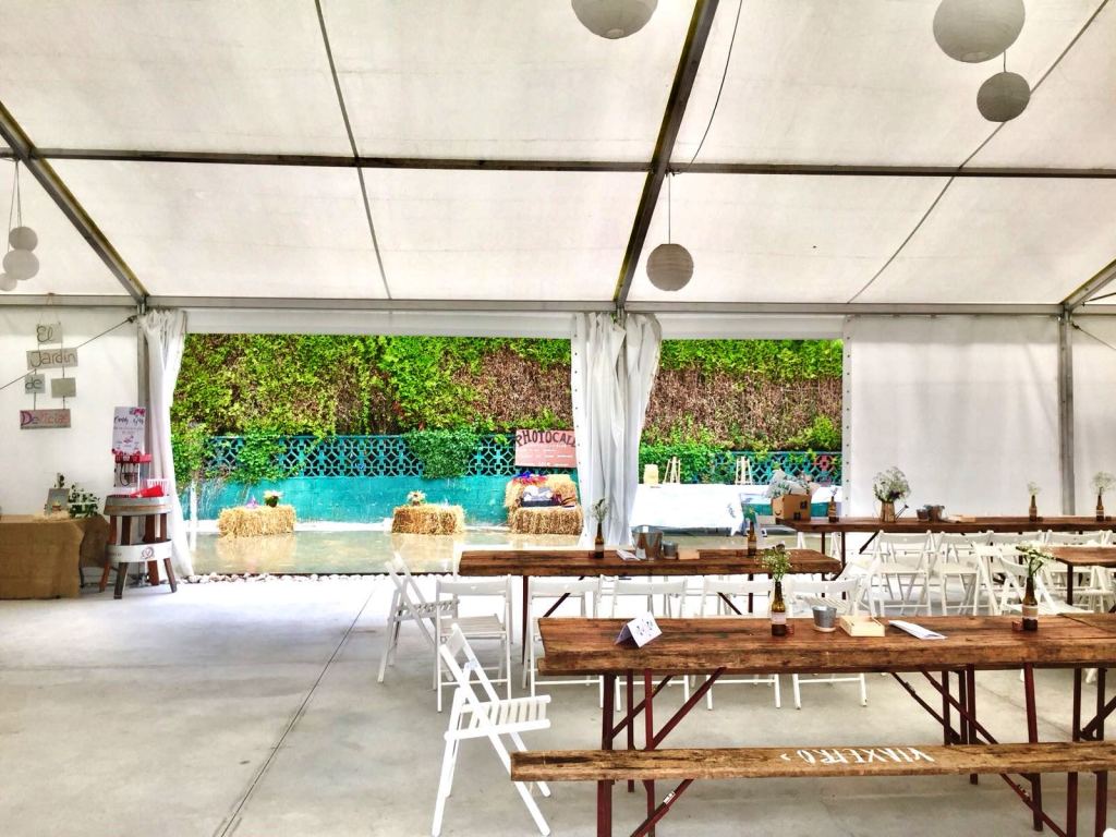 En el exterior, puedes poner la zona de aperitivos junto a la piscina o en el lugar de la finca que prefieras. Su extensión permite disfrutar de hinchables, juegos y otras actividades al aire libre.